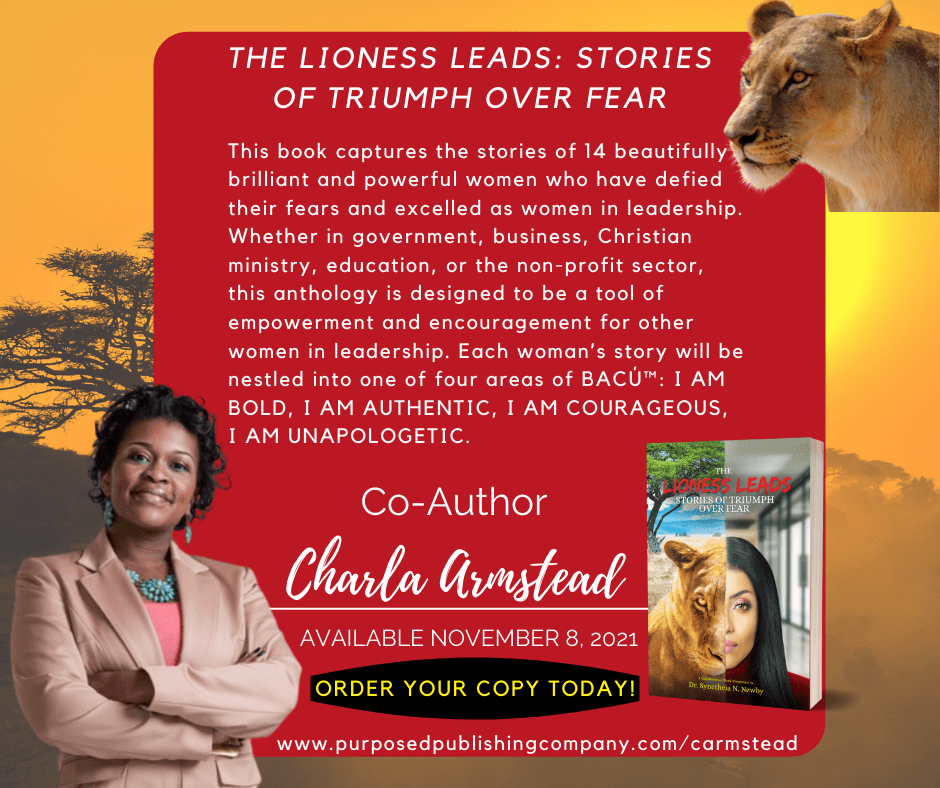 The Lioness Leads: Stories of Triumph Over Fear captures the stories of 14 beautifully brilliant and powerful women who have defied their fears and excelled as women in leadership. Whether in government, business, Christian ministry, education, or the non-profit sector, this anthology is designed to be a tool of empowerment and encouragement for other women in leadership. Each woman’s story will be nestled into one of the four areas: I AM BOLD, I AM AUTHENTIC, I AM COURAGEOUS, I AM UNAPOLOGETIC.