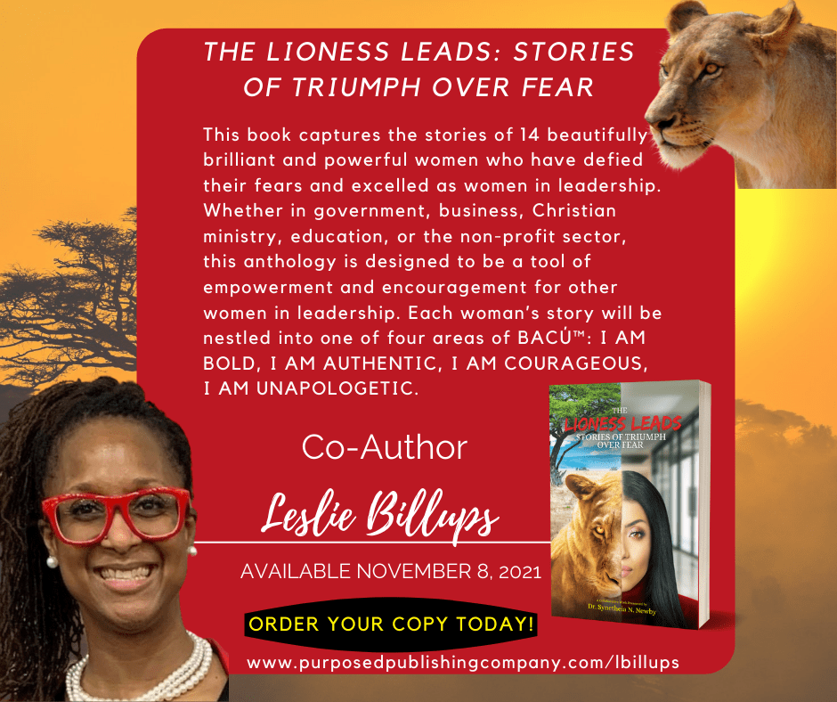 The Lioness Leads: Stories of Triumph Over Fear captures the stories of 14 beautifully brilliant and powerful women who have defied their fears and excelled as women in leadership. Whether in government, business, Christian ministry, education, or the non-profit sector, this anthology is designed to be a tool of empowerment and encouragement for other women in leadership. Each woman’s story will be nestled into one of the four areas: I AM BOLD, I AM AUTHENTIC, I AM COURAGEOUS, I AM UNAPOLOGETIC.